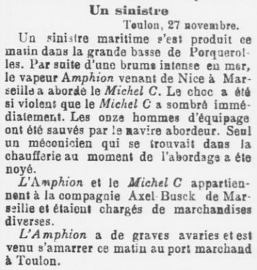 Durant la nuit du 26 au 27 novembre 1900, vers 2 h du matin, le Michel C fait route vers Cannes par temps très brumeux. Il transporte une cargaison de farine et de bière. L’ Amphion C, appartenant à la même compagnie, fait route, à 10 noeuds quant à lui, en direction opposée vers Toulon. À environ 500 mètres au sud, Sud-Est du Phare de l’ile du Grand Ribaud, les deux navires ne se voient pas. L’ Amphion C aborde le Michel C. Un marin breton de Paimpol nommé Goarin, marié et père de famille est porté disparu. Les 11 hommes d’équipage survivants n’ont que le temps de monter à bord de l’Amphion C avant de voir leur navire sombrer corps et bien. L’ Amphion C, malgré une voie d'eau importante, parvient à atteindre Toulon.