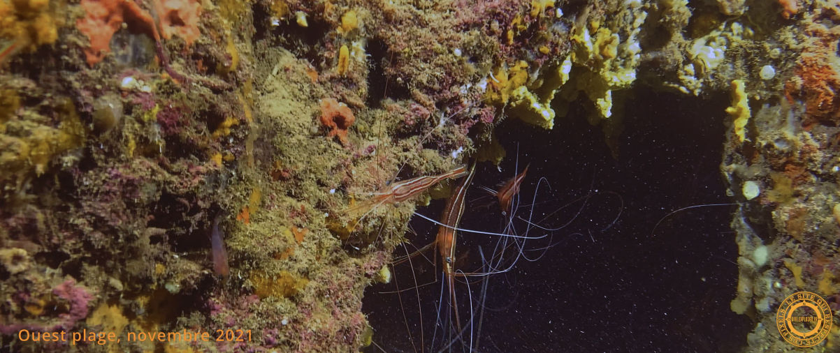 Nous découvrons dans cette plongée une multitude surprenante de crevettes narval qui s’étalent et tapissent les parois du coralligène donnant l’impression que celui-ci bouge. Leur corps svelte, rose orangé, marqué par deux lignes longitudinales blanches est posé sur dix pattes fines rouges. Leur tête se termine par deux antennes très longues. Les mâles sont légèrement plus petits que les femelles. La crevette narval aime prendre ses quartiers assez profonds sur des fonds vaseux, sableux ou sablo-vaseux. Elle fréquente aussi les grottes sombres peu profondes dès une dizaine de mètres.