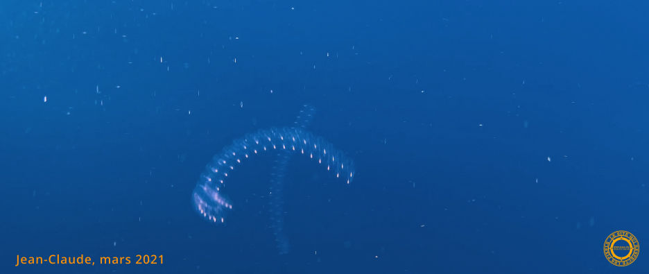 Au palier, suspendus à notre parachute, nous sommes entourés de Salpes. Vers la fin du dernier palier, nous assistons à un ballet de ceintures de Vénus. Nous sentons passer le plancton sur nos mains et sur notre visage. Une fois en surface, il nous faut remonter à l'échelle dans une mer bien formée.