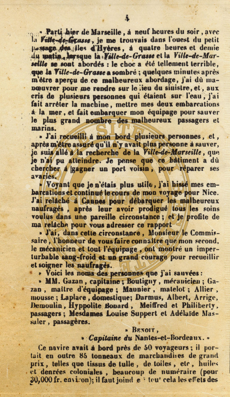 Parti de Marseille pour rallier Nice, il transportait 54 passagers et différentes marchandises telles que des étoffes, des tissus de tulle, des denrées coloniales, de l'huile. Dans la nuit du 16 décembre 1851, à 3 heures du matin, dans la petite passe séparant Porquerolles de l’île du grand Ribaud, il est percuté par le navire "Ville de Marseille". Pratiquement coupé en deux, il coule en faisant une quinzaine de victimes. L’ensemble de la cargaison est perdu. Le "Ville de Marseille" , gravement endommagé, sauve quelques naufragés et gagne rapidement Toulon toutes pompes en action. Au final, 23 personnes seront sauvées.