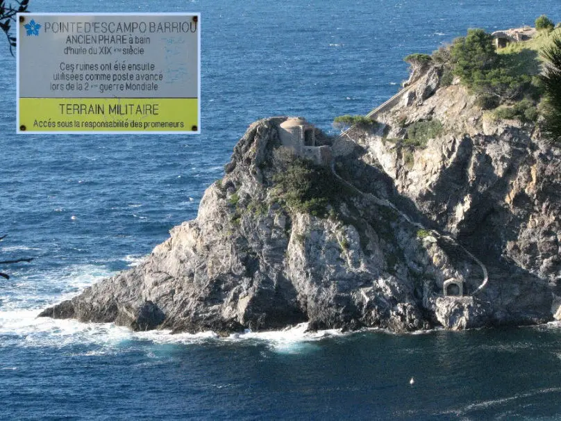 Les ruines d'un phare à bain d'huile du XIX eme siècle sont présente sur la pointe d'Escampo-Barriou (visible sur la photo). Un système de rails sur un pan incliné permettait de remonter la partie supérieure du phare pour le vidanger. Un petit débarcadère et des escaliers vertigineux sont accrochés à la roche.