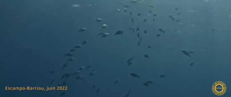 Nous brisons le miroir de la surface pour nous enfoncer dans une eau limpide, cristalline et chaude. Une belle prairie de Posidonies nous accueille. Nous nous équilibrons et partons lentement en direction de la pointe d'Escampo-Barriou. Quelques Sars communs survolent l'herbier devant nous. En tournant la tête vers le large, l'oeil se perd dans l'infini bleuté. À la limite du sable et de l'herbier, un banc de Mendoles passe lentement. Au sol, dans un fouillis d'algues, un Rouget barbet nous observe d'un air dubitatif. Il semble hésiter entre fuir ou rester. Un troupeau de Saupes broute l'herbier.