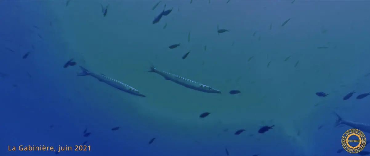 En pleine eau, à quelques mètres sous la surface, nous sommes environnés par un nuage de Castagnoles. Ce sympathique petit poisson virevolte gracieusement de-ci de-là. Quelques Mérous débonnaires se déplacent lentement. Un banc de Saupes en pyjama argenté rayé de jaune traverse notre champ de vision au-dessus des Mérous. Dans le lointain, des éclairs argentés attirent le regard. Un groupe de Bécunes appelés aussi Barracudas dans notre région s'approche lentement. Ce splendide poisson à la livrée argentée est l'un des habitants emblématiques des petits fonds.