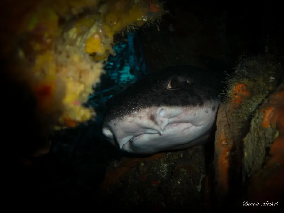Première rencontre : une petite Roussette délicatement posée sur le sable. Jean-Claude s'approche lentement et la filme jusqu'au moment où, lassée par notre présence, elle prend la fuite. Après quelques minutes de palmage, dans le lointain, un nuage de poussière attire notre attention. Nous nous approchons pour découvrir des centaines de Bernard-l'hermite en déplacement. Ils agitent leurs petites pattes et font même des bonds en avant, par-dessus des obstacles impressionnants pour leur taille. Certains d'entre eux sont littéralement recouverts de filaments mauves ou blancs. Ils sont issus de l'anémone qui vit en association avec eux. Dès le moindre dérangement, l'anémone, expulse des filaments collants et urticants. La foule des crustacés en déplacement provoque, chose rare, l'envol d'une Commatule qui, prise de panique, plane comme elle le peut dans le faisceau de la lampe de Jean-Claude. Elle vole en agitant ses dix bras puis, épuisée, se pose au milieu du troupeau. Celui-ci continu son avance tel un rouleau compresseur vers on ne sait quelle destination peut-être à la recherche d'une coquille accueillante pour le plus gros d'entre eux. Plus loin, une Bonellie rétracte sa trompe dans un gracieux mouvement pour se mettre à l'abris.