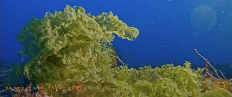 Nous nous dirigeons vers le sable, abandonnant les nombreuses langues de roche. Un peu à l'écart, une Gorgone supporte sans broncher le poids d'une grosse Araignée qui l'enlace de ses pattes grêles. Nous arrivons sur un fond recouvert de Laitue de mer et de débris variés. Un étrange gastéropode, l'Ombrelle, se meut avec lenteur, enjambant les obstacles au ralenti, dignement. Quelques Oursins lance rouge se sont regroupés à l'ombre d'une grosse Laitue de mer.