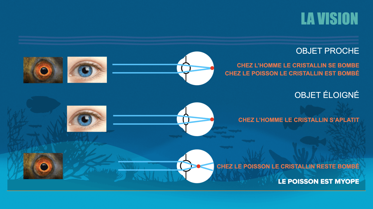 Les poissons ont développé des adaptations spécifiques pour voir sous l'eau. Les yeux des poissons sont généralement sphériques avec une grosse pupille, ce qui leur permet de focaliser la lumière différemment de nos yeux humains. Cette forme sphérique aide à compenser la réfraction de la lumière dans l'eau, permettant aux poissons de voir clairement un objet proche, et flou un objet lointain car le cristallin du poisson ne peut pas se déformer comme celui de l'homme.