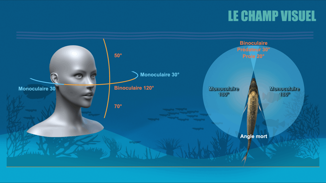Les poissons ont un champ de vision très large grâce à la position latérale de leurs yeux. Cette configuration leur permet de voir presque tout autour d'eux sans avoir à bouger la tête, ce qui est crucial pour détecter les prédateurs et les proies. La plupart des poissons ont un champ de vision de presque 360 degrés, mais cette large perspective a un coût : ils ont une vision binoculaire limitée, ce qui réduit leur capacité à percevoir le relief.