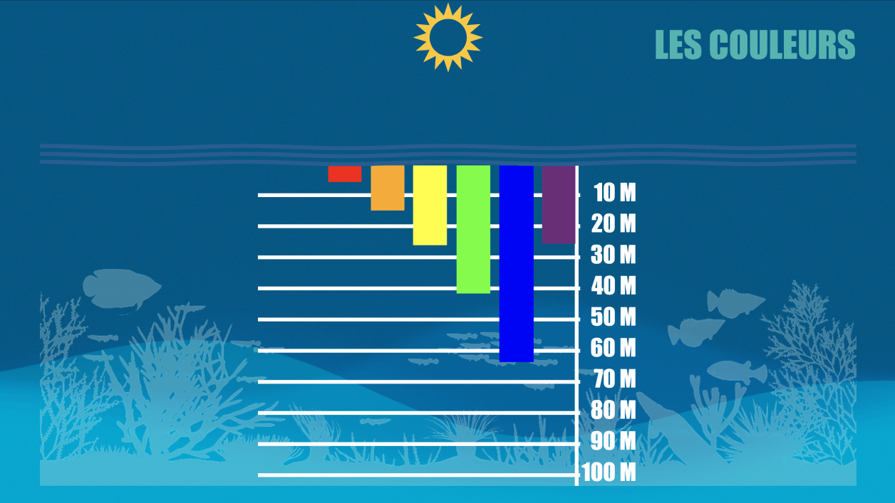 La lumière du soleil, qui apparaît blanche, est en réalité composée de toutes les couleurs du spectre visible. Lorsque cette lumière pénètre dans l'eau, elle est absorbée et diffusée par les molécules d'eau et les particules en suspension. Les couleurs à longue longueur d'onde, comme le rouge, sont absorbées plus rapidement que les couleurs à courte longueur d'onde, comme le bleu. C'est pourquoi, à mesure que l'on plonge plus profondément, les rouges et les oranges disparaissent, tandis que les bleus et les verts dominent.