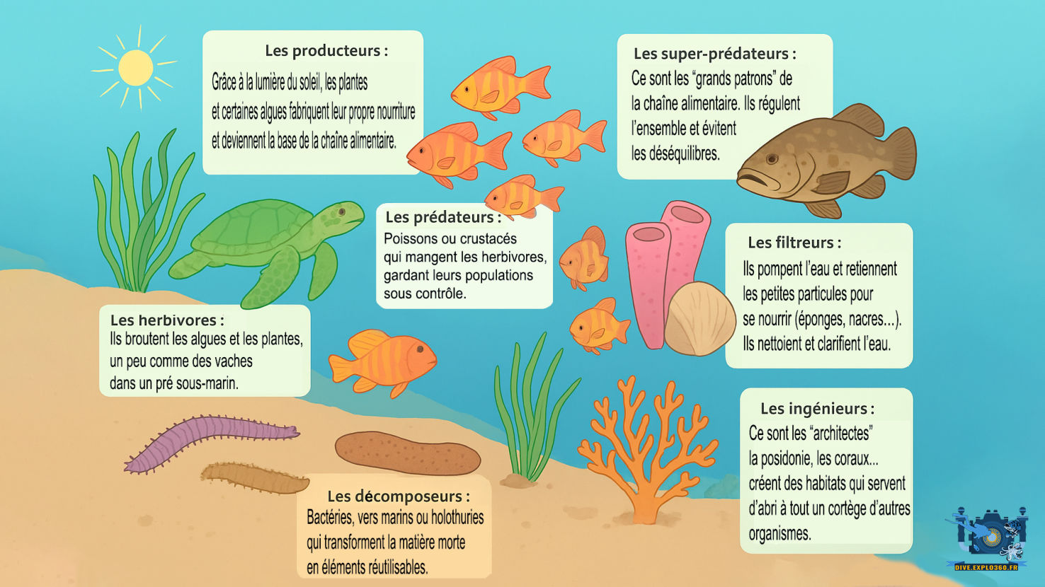 • Les décomposeurs : bactéries, vers marins ou holothuries qui transforment la matière morte en éléments réutilisables.