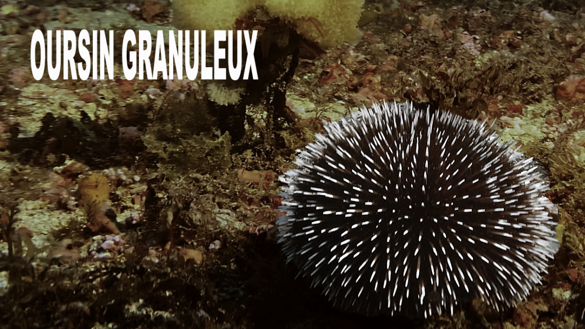 Qui arbore fréquemment une teinte violette, mais peut également revêtir des nuances marron ou rougeâtres ? Qui est pourvu de nombreux piquants : courts, épais, émoussés et blancs ? Qui se distingue par une taille supérieure aux autres oursins, adoptant une forme ronde légèrement aplatie ? C'est l'oursin granuleux ! Pour se camoufler, il se pare souvent de feuilles de posidonie ou de débris de coquilles qu'il maintient en place avec ses pieds souples dotés de ventouses, appelés podias.