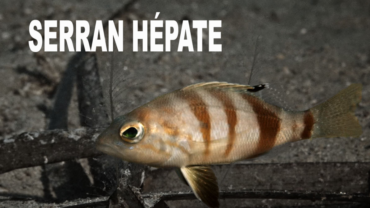Le Serran hépate appartient à la famille des Serrans, les cousins plus modestes des mérous. Son corps trapu est nettement plus petit que celui des autres membres de cette famille, au point de rappeler un juvénile de Serran chèvre. Il se distingue néanmoins par trois à cinq bandes transversales brun foncé, d’épaisseur variable, ainsi que par une tache sombre caractéristique sur sa nageoire dorsale. Sa particularité réside dans sa bouche protractile, capable de s’élargir pour capturer ses proies.