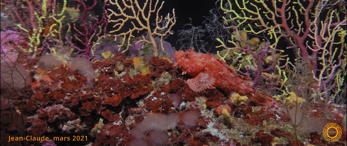 Un jardin de roches coralligènes éparses, dispersées au fond dans le plus grand désordre. Le faisceau de nos lampes éclaire des ombres furtives. Sur le fond, une rascasse nous attend...