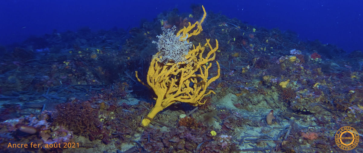 L'éponge "corne de cerf" ou Axinelle est très remarquable dans son habit jaune orange sous le faisceau de la lampe. Elle ressemble à un petit arbuste. Son aspect peut être modelé par les remous de l’eau et la force du courant.