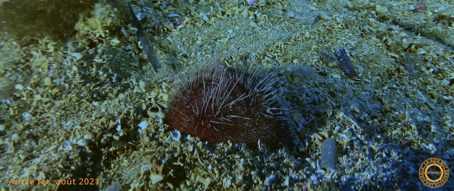 Nous brisons le miroir de la surface dans un large nuage de bulles. Le monde sous-marin se referme sur nous et nous descendons rapidement dans le bleu méditerranéen. Le fond sableux fait son apparition progressivement. Ce n'est d'abord qu'une légère clarté qui remplace, sous nos palmes, le bleu sombre. Viennent ensuite, sous forme de taches, les zones sableuses et rocheuses. Enfin, nous nous stabilisons au-dessus du fond, proche de petites roches basses. Quelques coups de palmes, en direction de celles-ci, et nous trouvons, sur notre chemin, à plat sur le fond, une grande ancre ancienne dans sa gangue de concrétions. Elle héberge un gros Spirographe qui a trouvé là un support à sa convenance. Après avoir abandonné l'ancre et repris notre cheminement en direction de la roche, nous découvrons une Roussette. C'est un poisson peu farouche, tant que nous gardons nos distances. Nous l'observons à loisir. Son voisin immédiat est un Oursin Spatangue pourpre qui n'est pas enfoui contrairement à son habitude.