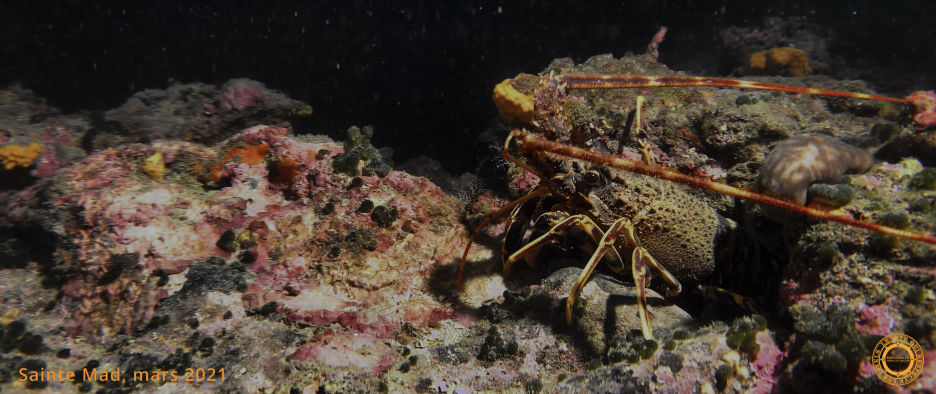 Les lèvres boudeuses, les yeux ronds et la peau recouverte d'excroissances, c'est un Chapon parfaitement immobile posé au début d'une roche. Une belle boule blanche rosée ! C'est une "Fraise de mer" qui met une touche de couleur sur le sable. Nous nous déplaçons lentement légèrement au-dessus du fond pour ne pas endommager le substrat. Nous arrivons à la hauteur d'une Salmacine posée sur le sable ou peut-être fixée sur un support que nous ne voyons pas, qui a pour voisin une Pennatule. C'est très étonnant, si c'est bien une Salmacine, elle ne devrait pas être là. Normalement, cette colonie de vers est toujours loin au-dessus du substrat. Nous sommes à présent sur la roche recouverte d'éponges. Dans un trou, une belle Langouste recule à notre approche. Son voisin immédiat est un Chapon.