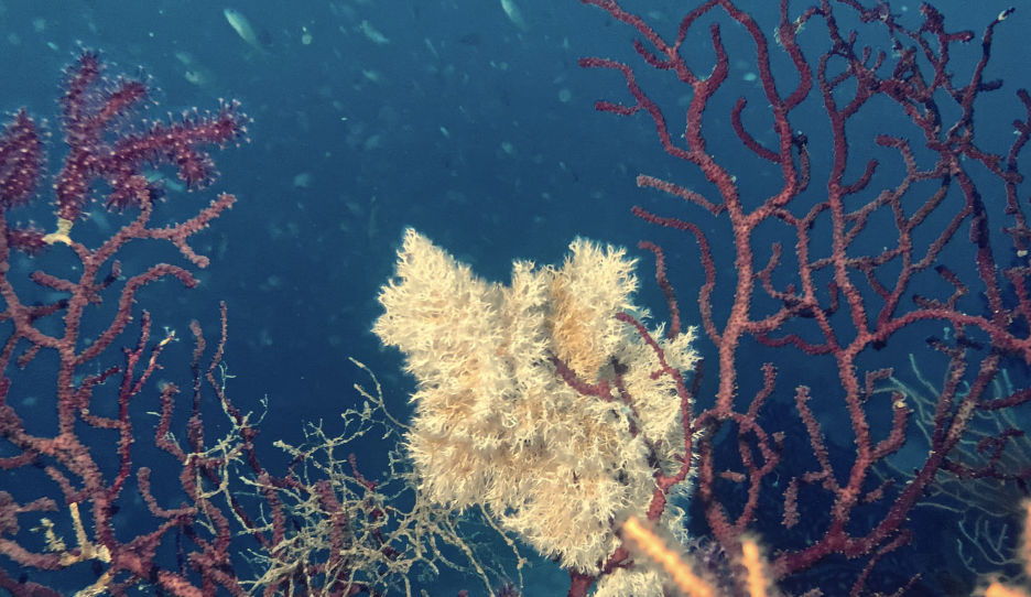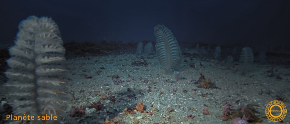 Nous arrivons sur le fond de sable près de quelques roches basses comme prévu. Sur le sable une belle Pennatule rosée en côtoie une plus petite. Elles oscillent, au gré du léger courant, en pleine partie de chasse. Le sable est jonché de Posidonies mortes. Un Pleurobranche tortue, tel un aéroglisseur, se déplace lentement. Plus loin, deux Pennatules nous attendent tous polypes déployés. Un étrange buisson blanc, surement un grand Hydraire plumeux, capte lui aussi les particules. La chance semble être de notre côté, la vie est foisonnante sur ce site.