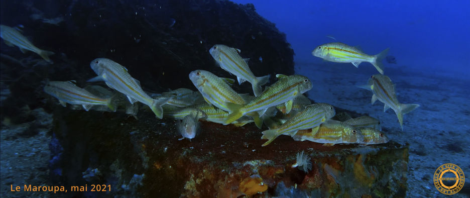 Un Rouget barbet décolle paresseusement et après un ou deux virages serrés, se pose à nouveau sur le fond juste à côté d'une Bonellie verte. Nous avançons dans un paysage coloré ou le jaune et l'orange prédomine. Devant nous, un petit troupeau de Rouget barbet s'égaille en tous sens.