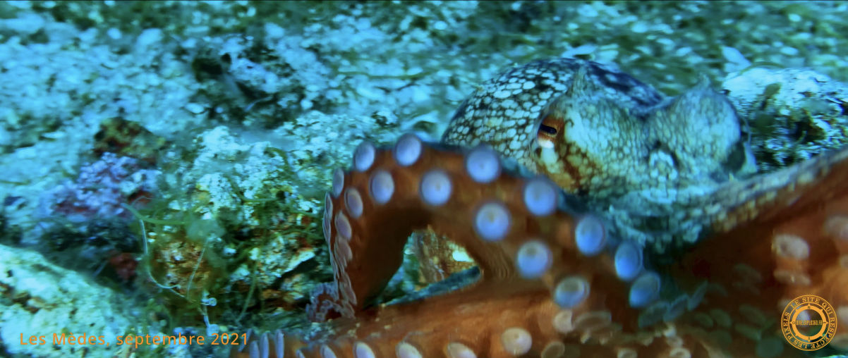 Sur la roche que nous longeons à présent, quelques Bourses de mer sont présentes. Sur le sable en contrebas, deux plongeurs sont en grande conversation avec un Poulpe. Après leur départ, je m'approche pour le filmer. En quelques secondes, il étreint mon caisson dans ses tentacules puissants et l'attire vers lui. Pour me libérer, j'allume, a pleine puissance, l'un de mes phares ce qui lui fait immédiatement lâcher prise.
