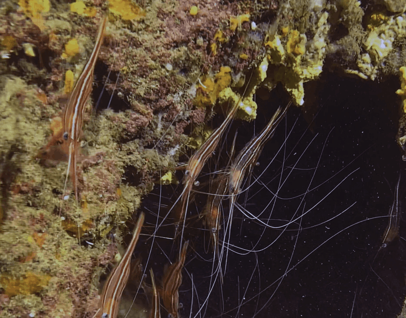 Nous découvrons dans cette plongée une multitude surprenante de crevettes narval qui s’étalent et tapissent les parois du coralligène donnant l’impression que celui-ci bouge. Leur corps svelte, rose orangé, marqué par deux lignes longitudinales blanches est posé sur dix pattes fines rouges. Leur tête se termine par deux antennes très longues. Les mâles sont légèrement plus petits que les femelles. La crevette narval aime prendre ses quartiers assez profonds sur des fonds vaseux, sableux ou sablo-vaseux. Elle fréquente aussi les grottes sombres peu profondes dès une dizaine de mètres.