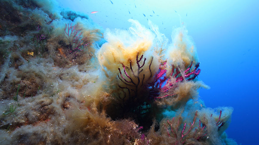 Au raz du sable, à l'intersection avec la tôle, toute une vie s'épanouie. Dans le moindre interstice, des Crevettes, des Murènes, des Congres. Nous revenons lentement vers le kiosque et prenons le chemin de la surface et des premiers paliers.