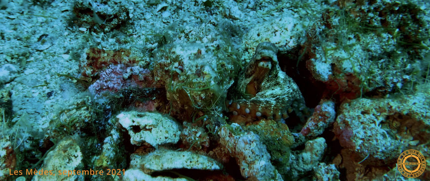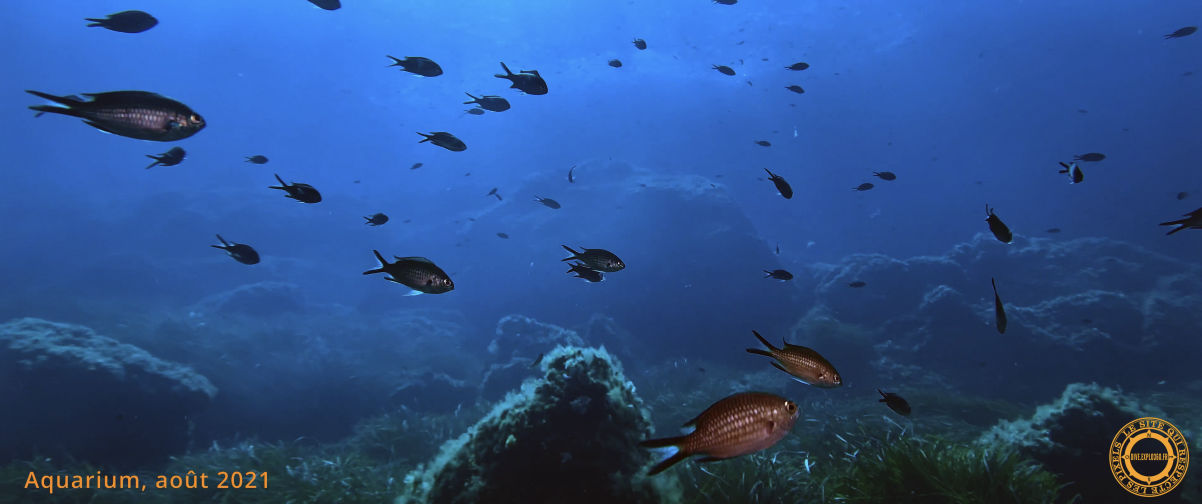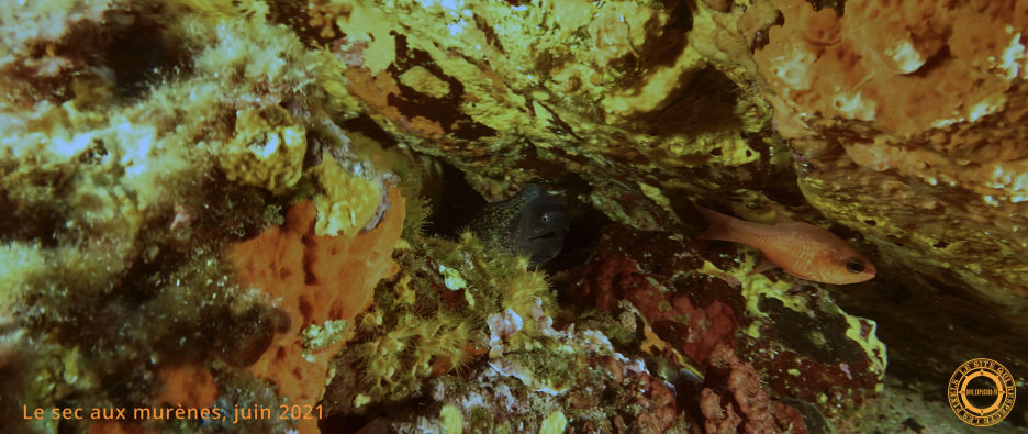 Une Murène, dans une faille profonde, presque horizontale, à élue domicile. Elle a pour voisin un Apogon. Sous un petit surplomb rocheux, une bande de Sars à tête noire sont en lévitation. À flanc de roche quelques oursins noirs tranchent sur le substrat rouge. Castagnoles noires, Serans chèvres oranges, Apogons rouges, Parazoanthus jaunes, c'est un délire de couleur.