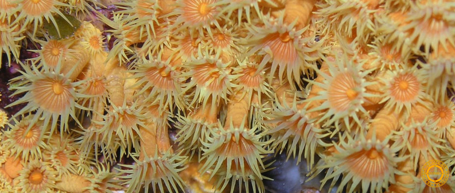 Une fois n'est pas coutume, nous amorçons notre descente en suivant la ligne qui retient la bouée mise en place parc le parc national de Port-Cros et Porquerolles. Dès l'immersion, nous sommes littéralement entourés par la vie sous-marine. Au sommet du sec, des Castagnoles se déplacent en tous sens sur un décor d'éponges encroûtantes orange et de Gorgones. À faible profondeur, les gorgones sont beaucoup plus petites et en rang moins serré. Un Mérou nous coupe soudain la route histoire sans doute de se faire remarquer et d'être présent sur la vidéo. Des Sars communs picorent la roche qui est constellée de Parazoanthus.