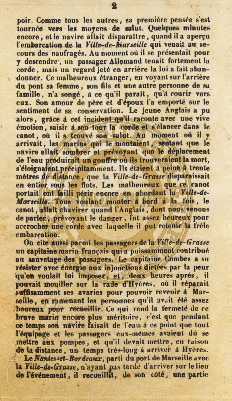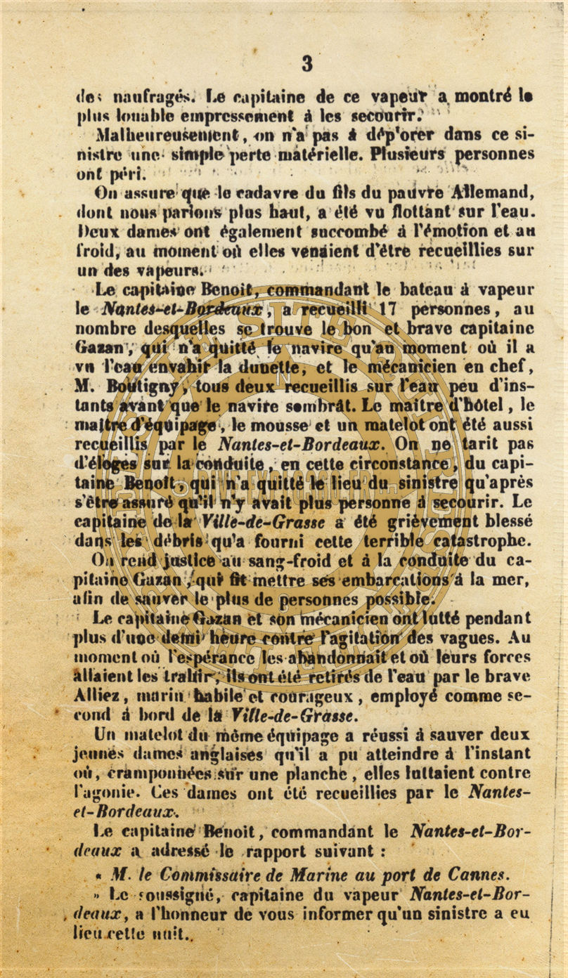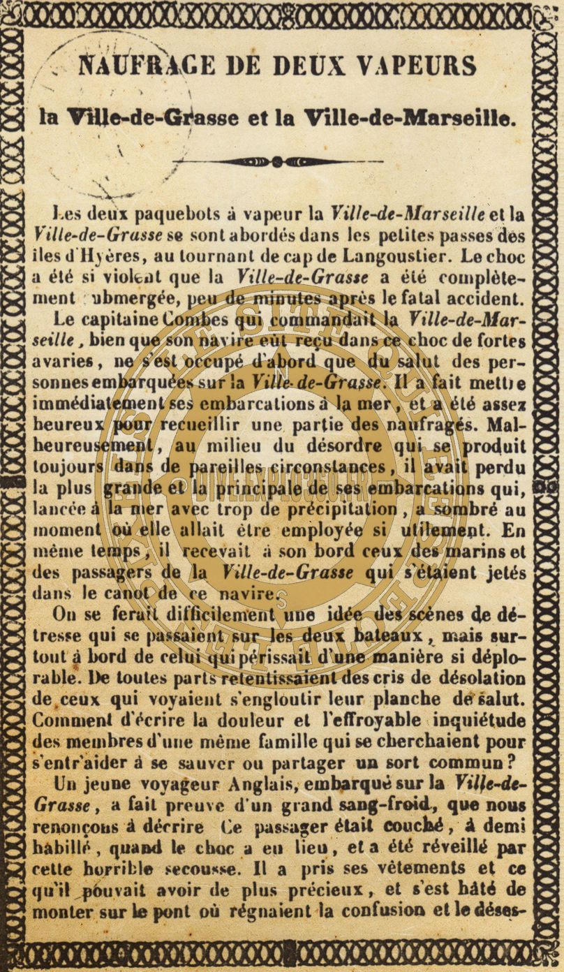 Le "Ville de Grasse" appartenait à la compagnie Grasse-Cannes pour laquelle il effectuait la navette entre Marseille, Cannes et Nice. Le Ville de Grasse, lancé en 1848 par les chantiers de la Seyne, était un vapeur qui possédait une longue cheminée de cuivre et trois-mâts. Propulsé par une chaudière de 70 CV, il jaugeait 150 tonneaux. Il figurait donc parmi les tout premiers bâtiments commerciaux à vapeur.