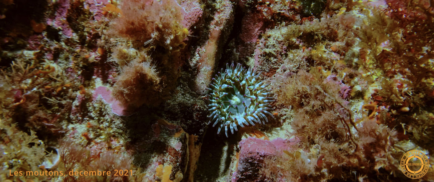 Avec Siu-Kwan nous basculons et descendons sur la zone que nous allons prospecter. Le fond est constitué de petites roches séparées par du sable. Un banc de poissons, bien fourni, s'étire au-dessus du fond. Il est composé de plusieurs espèces, dont des Sars à tête noire et des Mendoles (ou peut-être des Picarels, il est très difficile de les distinguer). Quelques Gorgones rouges ondulent doucement aux grés des vagues de surface. Elles sont envahies par des Oeufs de roussette complètement concrétionnés. Surement des oeufs de l'année précédente voir plus âgés. Sur la roche, un Oursin diadème a trouvé une faille dans laquelle il s'accroche. Coincé entre deux éponges encroutantes, une petite Langouste balaye l'espace avec ses antennes. Plus loin, c'est une Anémone charnue qui attend patiemment qu'une proie passe à portée de ses tentacules urticants.