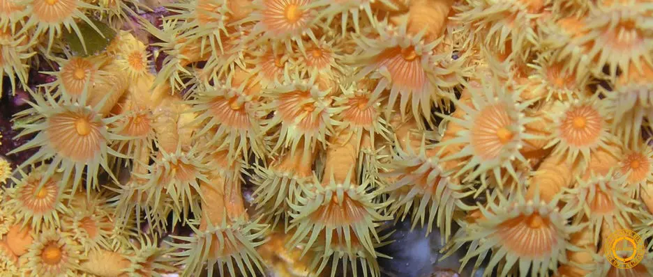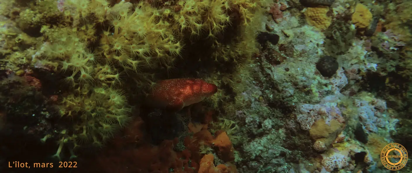 Nous atteignons le tombant qui prolonge sous l'eau la falaise de 119 mètres de haut. La roche sombre est parsemée d'éponges encroûtantes, d'Ascidies rouges et d'algues courtes. Devant une anfractuosité, des Apogons se donnent en spectacle. Virevoltant devant le Parazoanthus, des Girelles et un Sar à museau pointu tournoient.