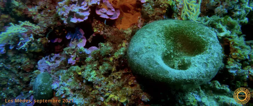 À l'approche de la roche, les premières Gorgones orange font leurs apparitions puis ce sont les Gorgones pourpres. Une magnifique Éponge oreille d'éléphant en forme de corolle filtre les particules en suspensions. Plus loin un petit Sar à tête noire prend la fuite complètement affolé par notre présence.