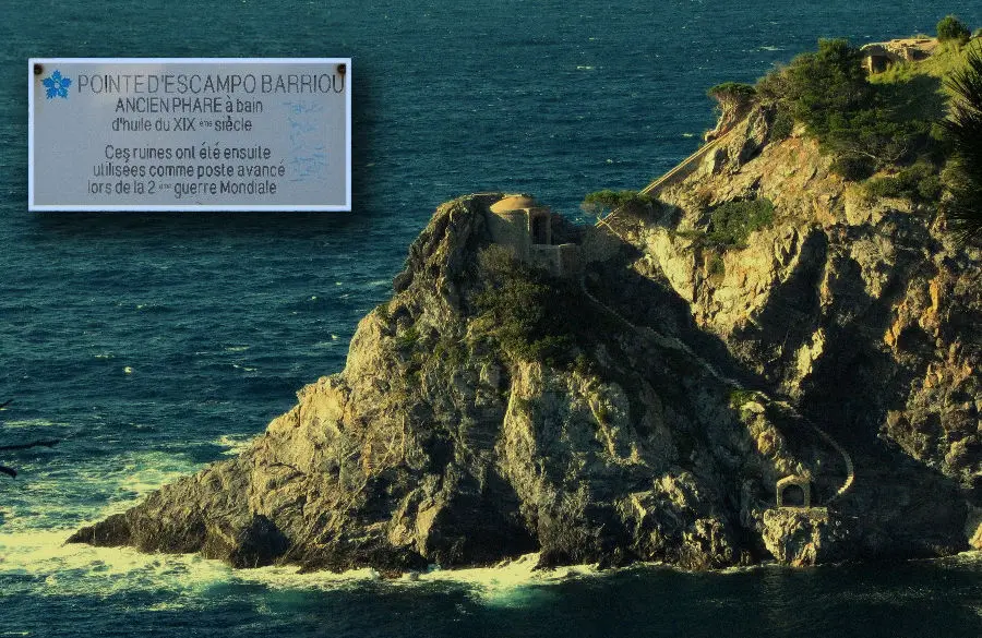 Les ruines d'un phare à bain d'huile du XIX eme siècle sont présente sur la pointe d'Escampo-Barriou (visible sur la photo). Un système de rails sur un pan incliné permettait de remonter la partie supérieure du phare pour le vidanger. Un petit débarcadère et des escaliers vertigineux sont accrochés à la roche.