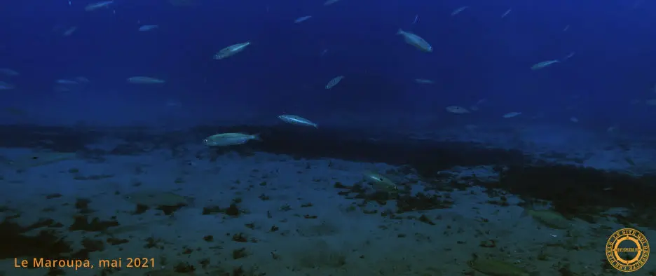 Nous brisons le miroir de la surface pour nous enfoncer dans une eau limpide, cristalline et chaude. Une belle prairie de Posidonies nous accueille. Nous nous équilibrons et partons lentement en direction de la pointe d'Escampo-Barriou. Quelques Sars communs survolent l'herbier devant nous. En tournant la tête vers le large, l'oeil se perd dans l'infini bleuté. À la limite du sable et de l'herbier, un banc de Mendoles passe lentement. Au sol, dans un fouillis d'algues, un Rouget barbet nous observe d'un air dubitatif. Il semble hésiter entre fuir ou rester. Un troupeau de Saupes broute l'herbier.