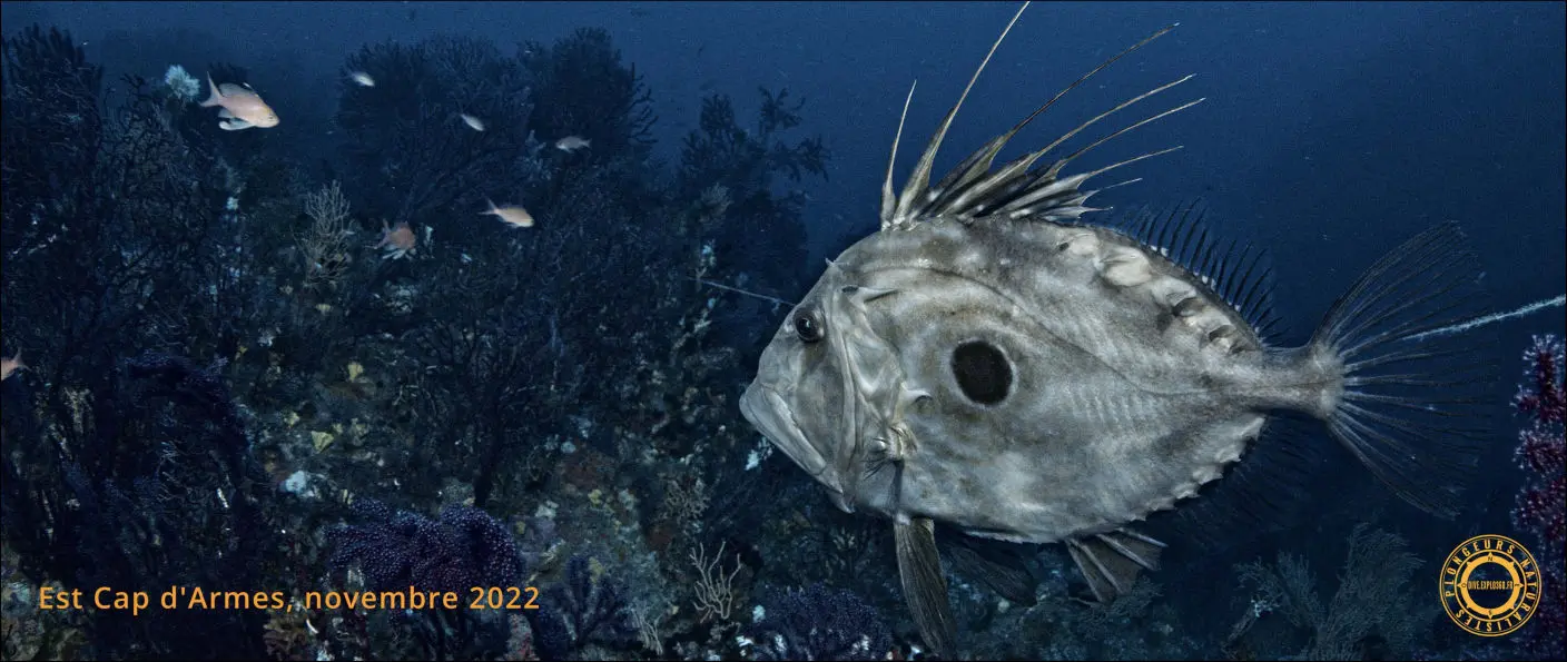 Soudain, devant moi, à moins de 50 centimètres, un Saint-Pierre solitaire de belle taille au corps haut et fortement comprimé latéralement apparait au détour d'une Gorgone pourpre. Contrairement à l'habitude, celui-ci ne prend pas la fuite et reste sagement devant l'objectif de la caméra se laissant admirer à loisir, les longs filaments de sa nageoire dorsale dressés fièrement. Sa robe argentée est striée par des bandes or du plus bel effet qui soulignent sa tache centrale noire. Ses nageoires transparentes frémissent rapidement. Au bout de quelques secondes, il couche ses filaments dorsaux, signe qu'il va prendre la fuite. Je l'accompagne sur quelques mètres.