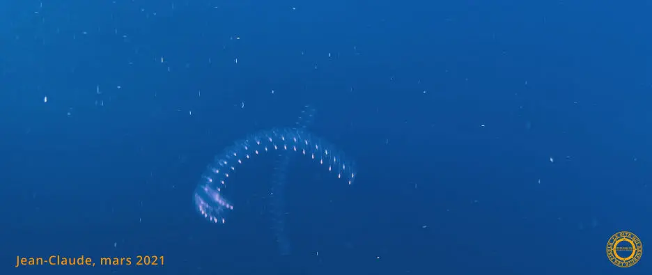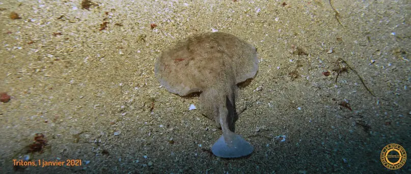 Après avoir fait le tour de la partie avant, nous revenons vers l'arrière en compagnie d'une petite Raie torpille qui nous ouvre le chemin. Depuis un mois environ nous croisons régulièrement des Raies torpille. Est-ce un hasard où une période propice ? Nous n'avons pas la réponse. La partie arrière fait à nouveau son apparition. Nous rejoignons la cassure puis le pont et enfin le bout qui remonte vers la surface. C'est maintenant la lente remontée pour faire nos paliers où nous sommes attendus par une Salpe.