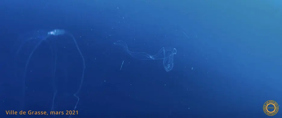 Nous amorçons notre remontée après avoir bien profité de notre plongée. Au premier Palier, nous avons comme compagnie une Méduse pélagique. Sa délicate ombrelle pulse l'eau régulièrement. Elle se détache nettement en contre-jour. En surface, les nuages ont dû faire place au soleil, car l'eau est plus claire. Nous avons perdu de vue notre compagne de palier. Nous remontons au palier suivant pour la retrouver ainsi qu'une Ceinture de Vénus.