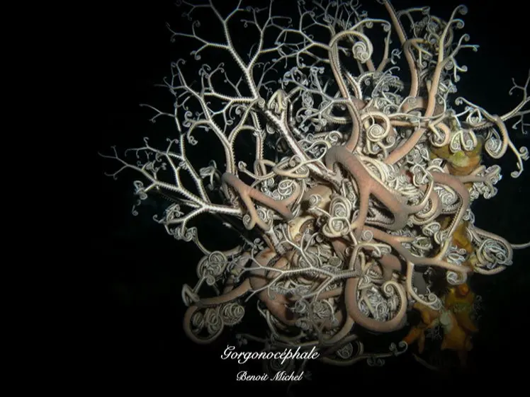 Sur certaines Gorgones, des Gorgonocéphales étalent leurs bras en tous sens. Curieusement, certains étendent qu'un seul de leurs nombreux appendices, comme un signal vers l'infini, tout en maintenant recroquevillés les autres.