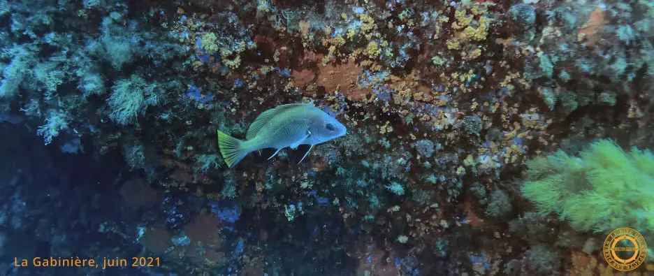 Le long d'une roche verticale tapissée de Parazoanthus jaunes, des Castagnoles noires batifolent sur le fond bleu méditerranéen. C'est un riche paysage où roches et Posidonnies se suivent et s'entremêlent. Une autre faille et c'est un Crénilabre paon qui y a trouvé refuge. La profondeur augmente. Les premiers Anthias font leur entrée en scène. Un couple de magnifique Corb est tellement surpris par notre arrivée qu'il ne sait pas quelle direction prendre. Sur une plateforme incurvée de petite taille, une Baudroie hirsute attend patiemment qu'une proie passe à sa portée. Son mimétisme est quasiment parfait.