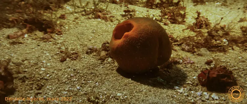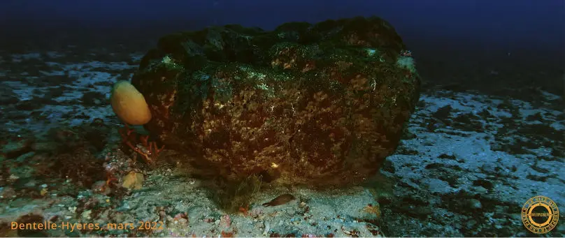 Nous nous déplaçons en direction d'un petit relief. Sur quelques mètres carrés, une débauche de vie nous attend. Ascidie rouge et plusieurs Éponges balle sont côte à côte au milieu d'un fouillis d'algues vertes et brunes. Autour de ce monticule, quelques Girelles tournoient paisiblement. Nous faisons lentement le tour pour découvrir une Ascidie noire et une ponte de Calmar qui oscille avec le courant. À ses côtés au sommet du monticule un Bernard-l'hermite héberge trois anémones fixées sur sa coquille.