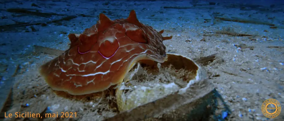 Nous poursuivons notre progression pour découvrir des Pleurobranches tortue en pleine reproduction. Certains couples ont déjà pondu, d'autres sont accouplés. Un grand Cérianthe pêche les microparticules qui lui servent de repas.