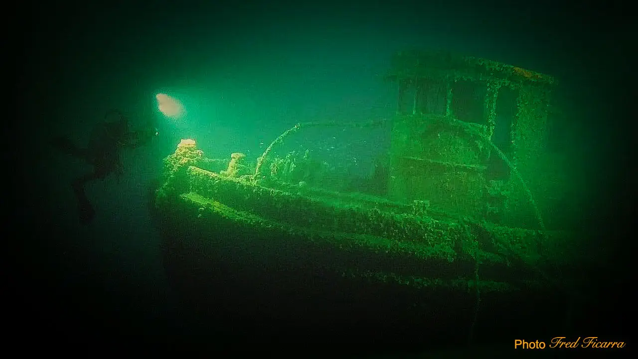 En quelques coups de palmes, nous nous approchons pour découvrir un bateau trapu, posé sur le fond, en position de navigation, avec une légère gite sur bâbord. Nous ouvrons la nuit devant nous à l'aide de nos phares de plongée. Une aussière encore fixée à l'avant flotte entre deux eaux. C'est surement le câble de remorquage auquel était accroché le Sally of New York lors de son naufrage.