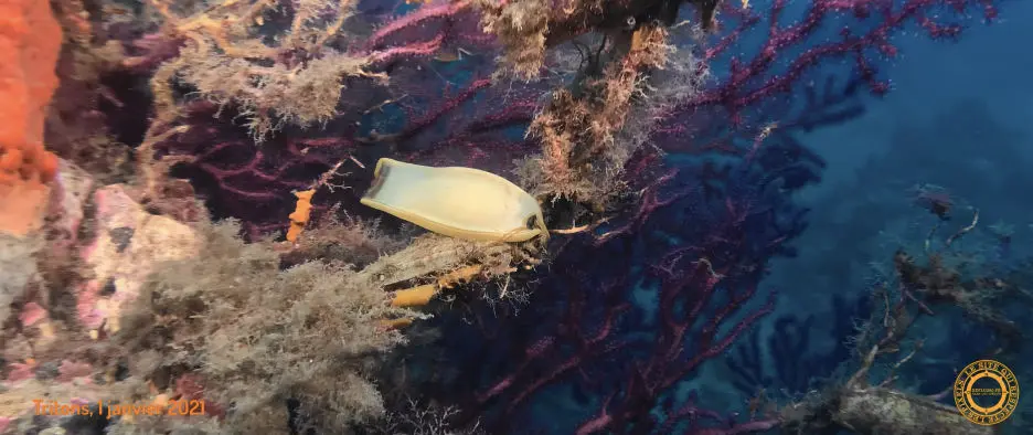 Au-dessus de nous, un énorme banc de Sar à tête noire défile lentement. Deux étoiles de mer communes sont alanguies sur la roche. Un petit Chapon orange vif essaye, sans succès, de disparaitre au milieu des Udotée vertes. Sur les quelques Gorgones pourpres, des Oeufs de roussette attendent leur heure pour éclore. Au détour d'une Gorgone, un Mérou débonnaire nous regarde d'un oeil curieux. Les Posidonnies sont à cette saison beaucoup plus vertes et courtes que pendant la période estivale. Elles recouvrent une vaste étendue au pied du relief. Des Girelles, en grand nombre, tournoient au-dessus d'elles.