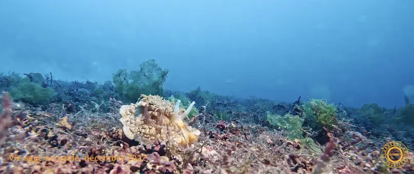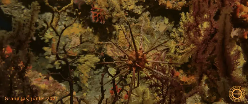 Nous nous dirigeons vers le sable, abandonnant les nombreuses langues de roche. Un peu à l'écart, une Gorgone supporte sans broncher le poids d'une grosse Araignée qui l'enlace de ses pattes grêles. Nous arrivons sur un fond recouvert de Laitue de mer et de débris variés. Un étrange gastéropode, l'Ombrelle, se meut avec lenteur, enjambant les obstacles au ralenti, dignement. Quelques Oursins lance rouge se sont regroupés à l'ombre d'une grosse Laitue de mer.