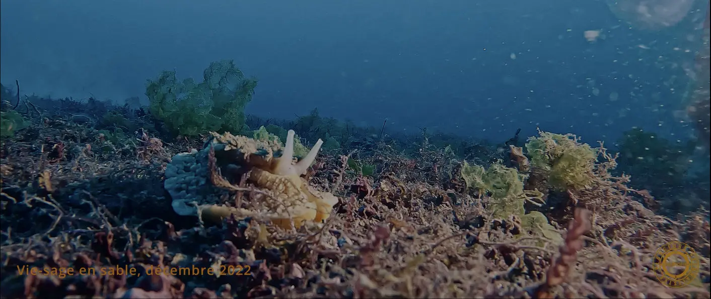 Le paysage qui s'offre à nous est un fond de sable grossier duquel émergent par endroit des langues de roche très longues et basses. Dans le lointain, des poissons aux reflets argentés, Mendoles, Picarels ou Bogues, difficile à dire, survolent le lieu en bancs épars. Sur les reliefs des petites Gorgones pourpres ployant sous les Oeufs de Roussette concrétionnés frémissent dans le léger courant.