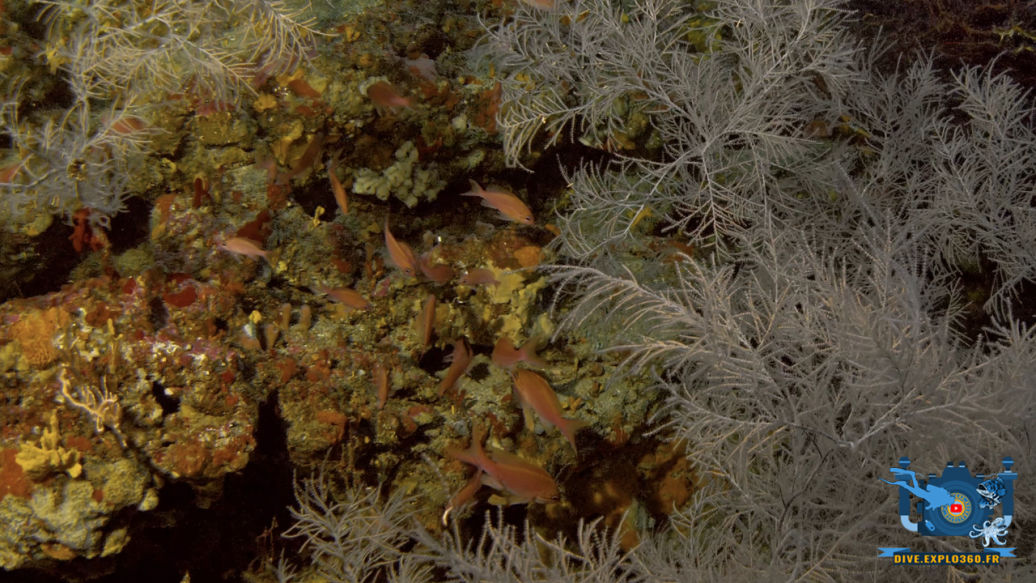 Plus profond, là où la lumière est faible, on trouve les fonds coralligènes. Ils sont construits très lentement par de petites algues rouges qui fabriquent du calcaire, un peu comme si elles empilaient de minuscules briques. Cet univers abrite des gorgones, des éponges colorées et aussi le corail noir. Malgré son nom, ce corail est vivant et recouvert de petits polypes blancs, ce qui le fait paraître blanc sous l’eau. Il sert d’abri et de support à de nombreux animaux. Ce milieu est très beau mais fragile : il faut le protéger pour qu’il continue à abriter toute cette vie.