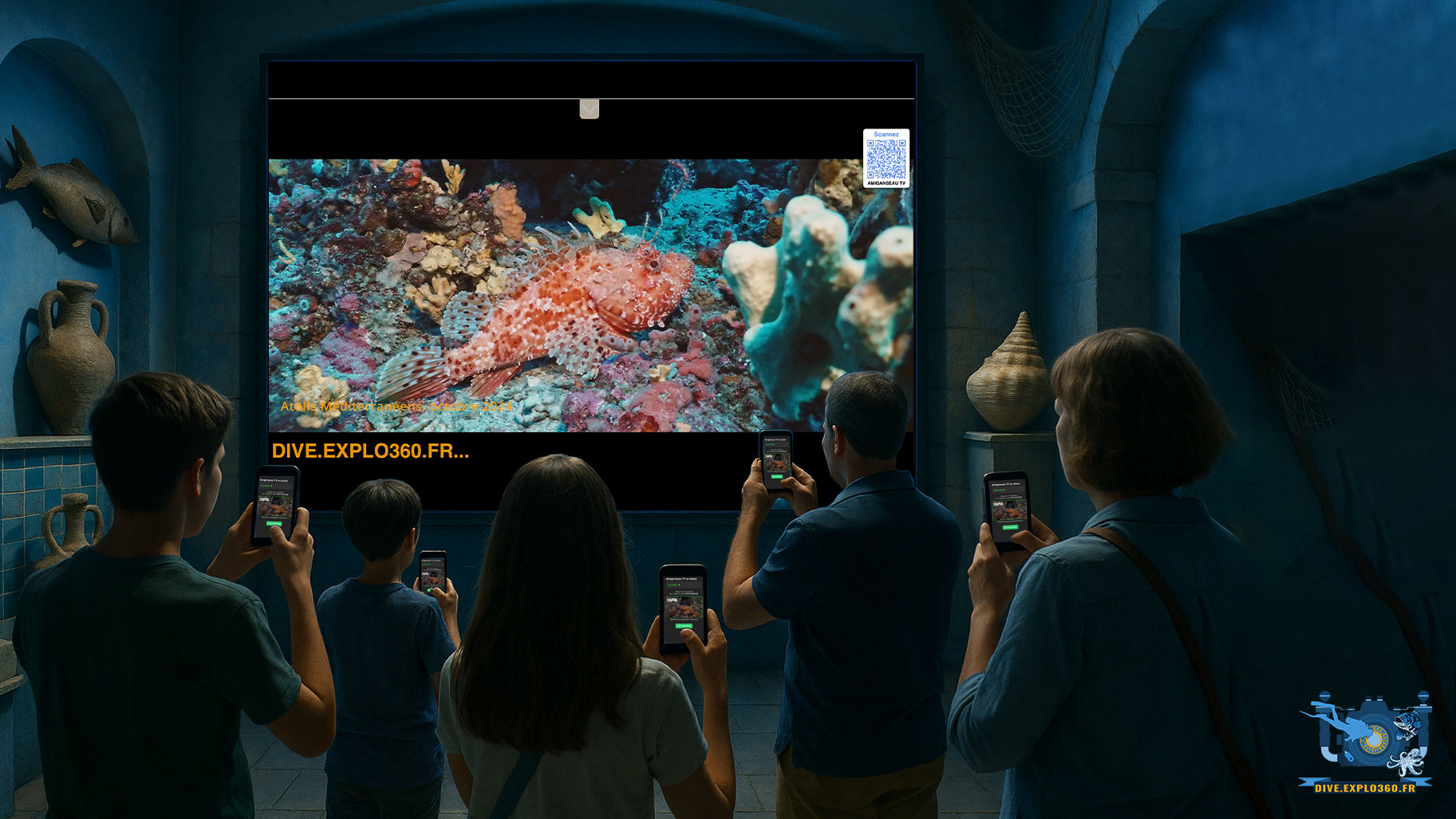 Les visiteurs découvrent un flux immersif de vidéos sous-marines 4K issues d’une vidéothèque intégrée de plus de 100 vidéos en constante évolution.
